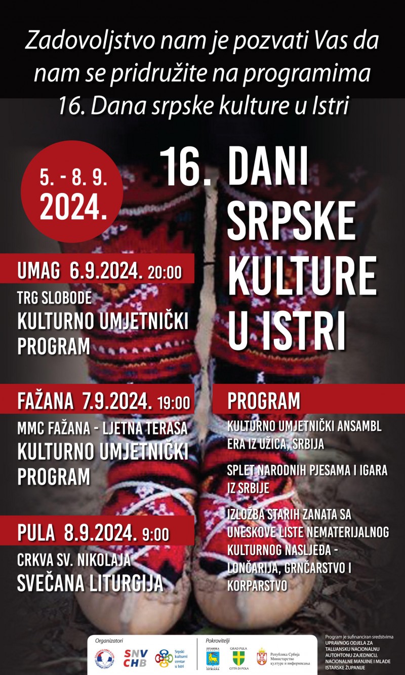 16. Dani srpske kulture u Istri održat će se u dva istarska grada, Umagu i Fažani. Ova manifestacija je prilika da zajedno proslavimo bogatstvo i raznolikost srpske kulturne baštine kroz glazbu, ples i umjetnost.