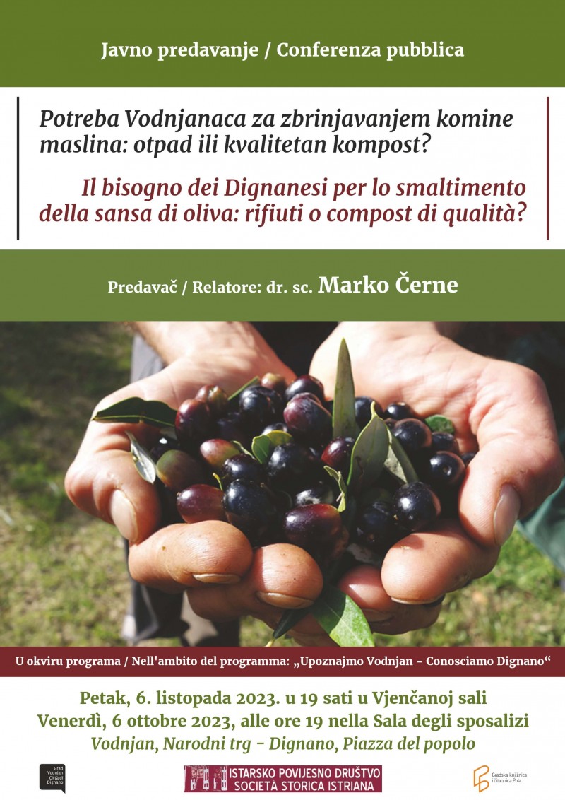 U petak, 6. listopada 2023. u Sali za vjenčanja na Narodnom trgu u Vodnjanu predavanje Potreba Vodnjanaca za zbrinjavanjem komine maslina: otpad ili kvalitetan kompost? održat će dr. sc. Marka Černe.