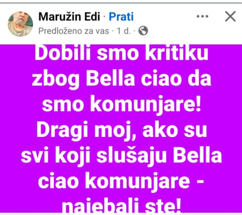Gustafi su, u sklopu novogodišnjih svirki, izveli i kultnu pjesmu “Bella ciao”, nakon čega su, kako navodi Maružin, stigle i kritike uz etikete koje se u današnjem društvu dijele brže nego konfeti u ponoć. Upravo na to Edi je reagirao kratkom, ali jasnom porukom koja je pogodila ravno u srž ideološki podijeljene svakodnevice.