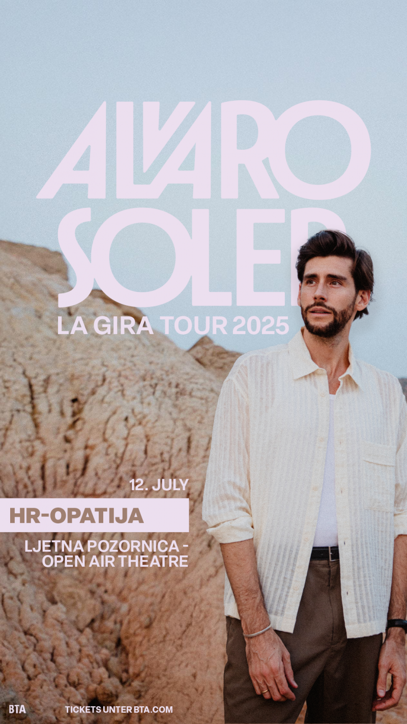 Njegovu glazbu opisuju kao savršen spoj pozitive, plesa, španjolskog temperamenta – idealan za uživanje u toploj ljetnoj večeri. Sa svojim nastupima puni arene diljem Europe, a ove godine se na mapi njegove velike europske turneje „La Gira Tour 2025“, nalazi i jedan hrvatski grad i to Opatija. Alvaro Soler, nastupa 12.7. na Ljetnoj pozornici u Opatiji !