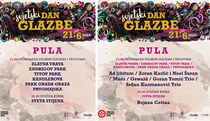 Više od 300 glazbenika nastupima po cijeloj Hrvatskoj obilježava Svjetski dan glazbe 2024.! Tradicija proslave Svjetskog dana glazbe nastavlja se i ove godine na prvi dan ljeta. Tako će i HGU Pula uz mnoštvo drugih gradova proslaviti Svjetski dan glazbe. Izvođači raznovrsnih glazbenih žanrova, u petak, 21.6. ponudit će svojim građanima, ali i drugim slučajnim prolaznicima, gostima i znatiželjnim turistima glazbene poslastice na mnogobrojnim lokacijama u samom centru grada.