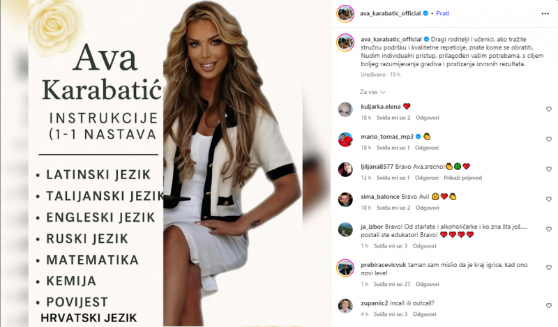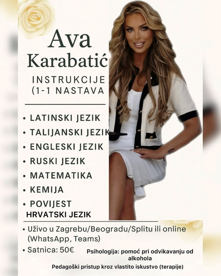 Nekada poznata po reality nastupima, ekscentričnim izjavama i najavi predsjedničke kandidature, bivša starleta Ava Karabatić odlučila je zakoračiti u svijet obrazovanja. Na društvenim mrežama najavila je da drži individualne instrukcije iz latinskog, talijanskog, hrvatskog, engleskog i ruskog jezika, ali i iz matematike, kemije te povijesti.