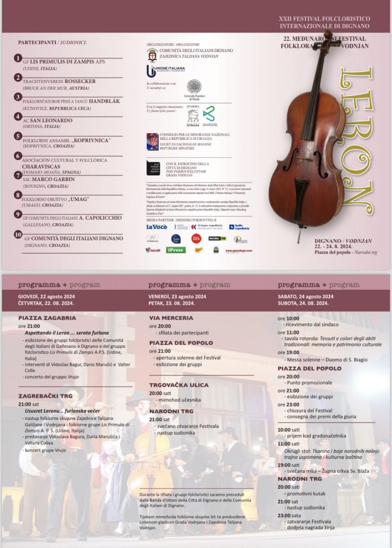 Festival je počeo u četvrtak, a svečano otvorenje je u petak, 23. kolovoza u 20 sati uz mimohod i nastupe folklornih skupina. Leron završava u subotu, 24. kolovoza s okruglim stolom o narodnim nošnjama, misom, promotivnim štandovima i glavnim nastupima. U 23 sata planirano je zatvaranje Festivala uz dodjelu nagrada žirija.