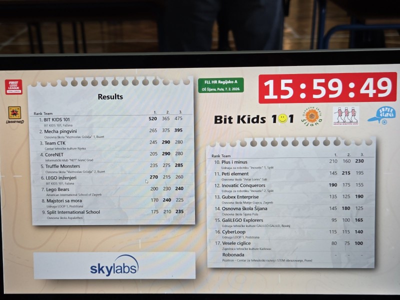 Jučer, 7. veljače 2026., dvije ekipe Udruge za informatiku i robotiku Bit Kids 101 iz Fažane nastupile su u polufinalu 10. FIRST LEGO League Hrvatske te ostvarile zapažene rezultate.