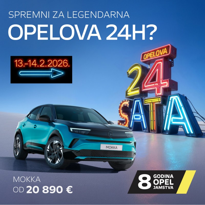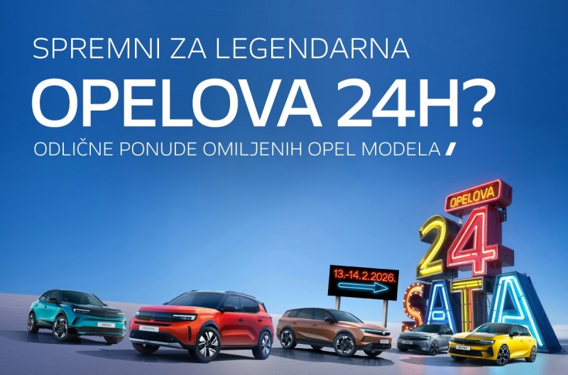 Sve je spremno, odbrojavanje je počelo, Opel vraća svoju legendarnu akciju 24 sata, tijekom koje će najpopularniji modeli biti dostupni po akcijskim cijenama! Samo 13. i 14. veljače 2026., odabrani Opelovi modeli osobnih i gospodarskih vozila bit će dostupni uz ekskluzivne popuste i jedno od vodećih Opel jamstava, 8 godina na osobna vozila, odnosno 5 godina na gospodarska vozila. Petak 13. i Valentinovo donose vremenski ograničenu ponudu, stoga budite spremni za brzu odluku i još bržu isporuku vašeg novog Opel vozila.