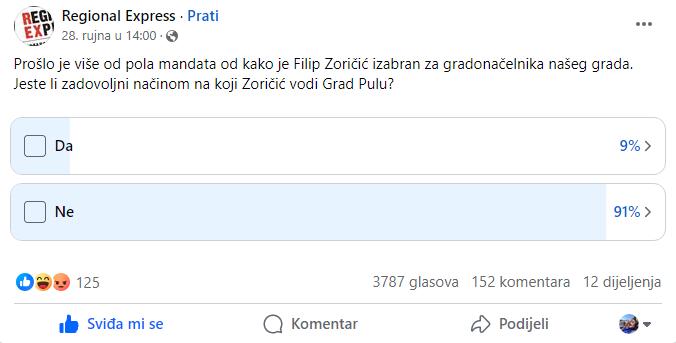 Utrka za berbu glasova nezadovoljnih građana već je počela. Podsjetimo, u anketi Regional Expressa gotovo 4.000 građana glasalo je protiv načina na koji Filip Zoričić vodi Grad Pulu, što je vrlo velika brojka kad zaključimo da ih na izbore za Mjesne odbore izađe oko 6.000.