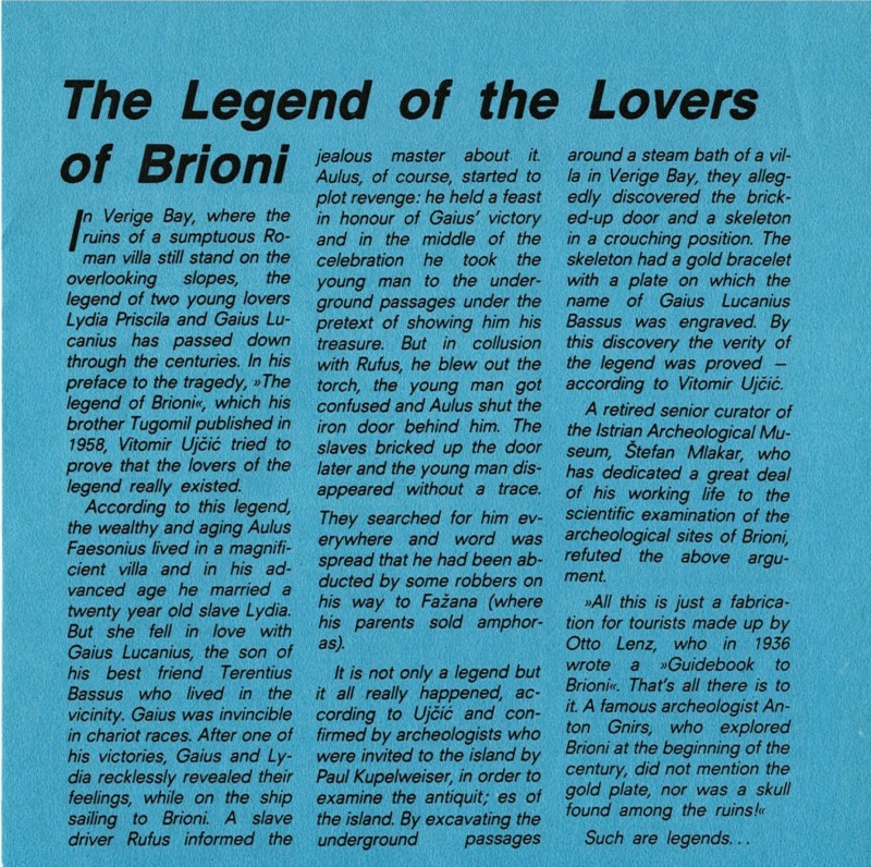 Prema toj legendi, bogati i ostarjeli Aul Faesonije živio je u veličanstvenoj vili te se u poodmakloj dobi oženio dvadesetogodišnjom robinjom Lidijom. No ona se zaljubila u Gaja Lucanija, sina njegova najboljeg prijatelja Terencija Basa, koji je živio u blizini. Gaj je bio nepobjediv u utrkama dvokolica. Nakon jedne od svojih pobjeda, Gaj i Lidija nepromišljeno su otkrili svoje osjećaje dok su brodom plovili prema Brijunima. O svemu je ljubomornom gospodaru dojavio nadzornik robova Rufus.