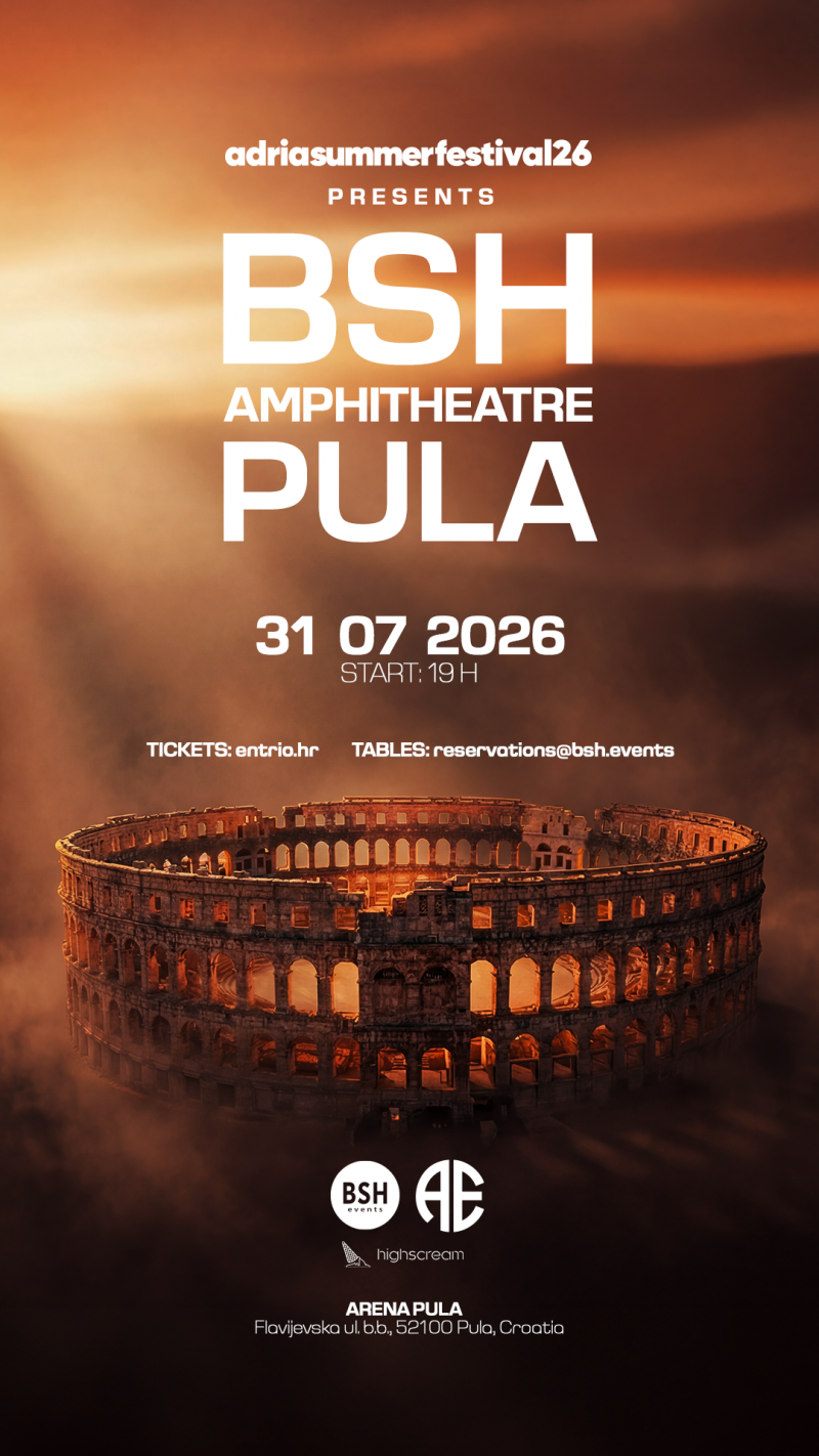 U sklopu programa Adria Summer Festivala 2026, ovaj svjetski poznati rimski amfiteatar ugostit će BSH party spektakl, koncept koji je danas prepoznat kao najuspješniji hrvatski međunarodni glazbeni proizvod elektroničke scene. Dosljedno birajući posebne, povijesne i vizualno impresivne lokacije, BSH je izrastao u brend koji nadilazi klasični party format i privlači publiku iz cijelog svijeta.