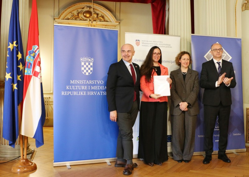 Jučer je u Zagrebu održana svečana dodjela ugovora o bespovratnim sredstvima u sklopu poziva „Inkluzivne usluge ustanova u kulturi“, koji provodi Ministarstvo kulture i medija Republike Hrvatske. Ugovore su uručili ministrica kulture i medija Nina Obuljen Koržinek, ministar rada, mirovinskog sustava, obitelji i socijalne politike Alen Ružić te ravnatelj Hrvatskog zavoda za zapošljavanje Ante Lončar. Na poziv je pristiglo više od 100 projektnih prijedloga, od kojih je odabrano 29 projekata za financiranje iz Europskog socijalnog fonda plus i državnog proračuna.