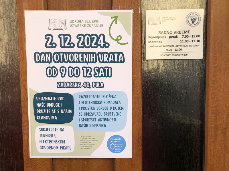 U prostoru Udruge slijepih Istarske županije u Puli u ponedjeljak, 2. prosinca, održan je Dan otvorenih vrata. Druženju se odazvalo 15-ak članova Udruge svih generacija koji su uz predsjednika Zlatka Kuftića, videće pratiteljice i djelatnice Udruge te volontere proveli jutro u opuštenoj atmosferi.