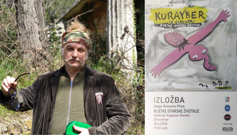 Sav taj čudesni svijet donosi nam Diego Bosusco Ptica, koji, kao što mu i ime govori, nikad ne zna da li je u zraku ili se tu i tamo spusti na zemlju. Altro ke Apollo-Sojuz… Čudesni svijet rijetkih istarskih životinja izvirit će dana 18. travnja u Muntiću, Galerija Kapelan. Pa ako na trenutak zastanete, budete tihi i pozorno slušate, možda ih i vi ugledate i trajno se nastanite u tom čudesnom svijetu neotkrivenog nacionalnog blaga magične nam Istre.