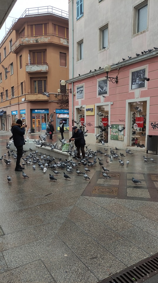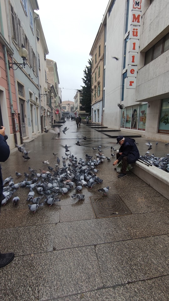 Uhvatili smo lijepe prizore u centru Pule na ovako tmuran i kišan dan. Dobri duh Pule, hrani golubove žitom. Gospodin koji ga fotografira kaže kako popije s njim kavu i uvijek mu da pokoji euro da kupi životinjama hranu.