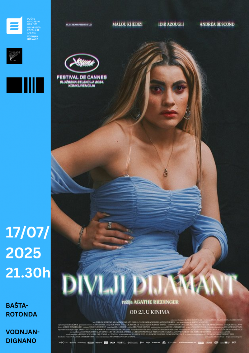U četvrtak, 17. srpnja, s početkom u 21.30 sati u Bašti, na programu je 3. film ovogodišnjeg Art kina „Cineast“, „Divlji Dijamant“ redateljice Agathe Riedinger. Odvažna, temperamentna, glasna i opsjednuta snovima o slavi, 19-godišnja Liane kandidatkinja je iz snova za svakog ozbiljnog producenta reality showa. Kada napokon dobije priliku na audiciji za emisiju Miracle Island, u kojem 15 mladih i zgodnih ljudi živi zajedno u kući na plaži, čini se da je uspjeh iza ugla. Prvi film francuske redateljice Agathe Riedinger britki je presjek današnje kulture instant zvijezda, društvenih mreža i influencera, u kojoj biti viđen znači postojati, a ispunjenost se može postići tek dosezanjem svetoga grala slave. Ulaz je besplatan, a u slučaju kiše ili vjetra projekcija će se održati u Domu mladih.