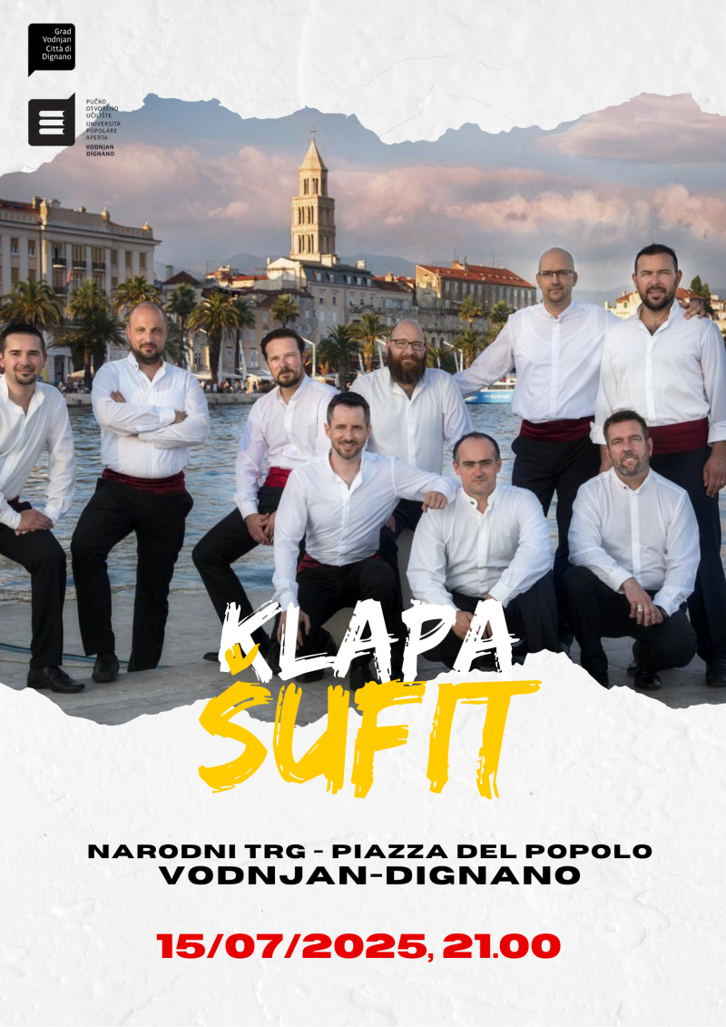 Sutra navečer na Narodnom trgu u Vodnjanu s početkom u 21 sat očekuje nas prava poslastica: nastup Klape Šufit. Klapa Šufit je jedna od najistaknutijih muških klapa iz Splita, osnovana 1992. godine u potkrovlju (dalmatinski “šufit”) Gimnazije „Marko Marulić“ pod vodstvom prof. Tomislava Veršića. Njihovi nastupi su emotivni i profesionalni, s izvornim a cappella izvedbama i modernim aranžmanima uz instrumente, što ih čini izuzetno raznolikim i privlačnim širokoj publici. Izvođenje narodnih evergreena (npr. Oliverove „Cesarice“) dodatno pojačava nostalgični naboj i vezu s publikom. Nema dvojbe da nas na trgu očekuje pravi ljetni spektakl.