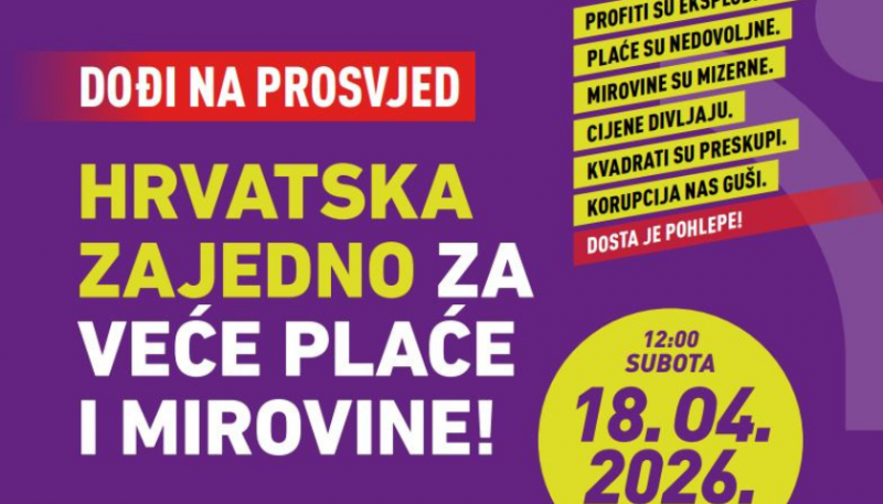 U subotu, 18. travnja 2026. godine, u Zagreb održat će se prosvjed pod nazivom 'Hrvatska zajedno za veće plaće i mirovine'. Okupljanje građana najavljeno je u 11 sati ispred Hrvatskog narodnog kazališta, nakon čega će povorka krenuti Frankopanskom ulicom prema Trg bana Jelačića, gdje je središnji skup predviđen u 12 sati.