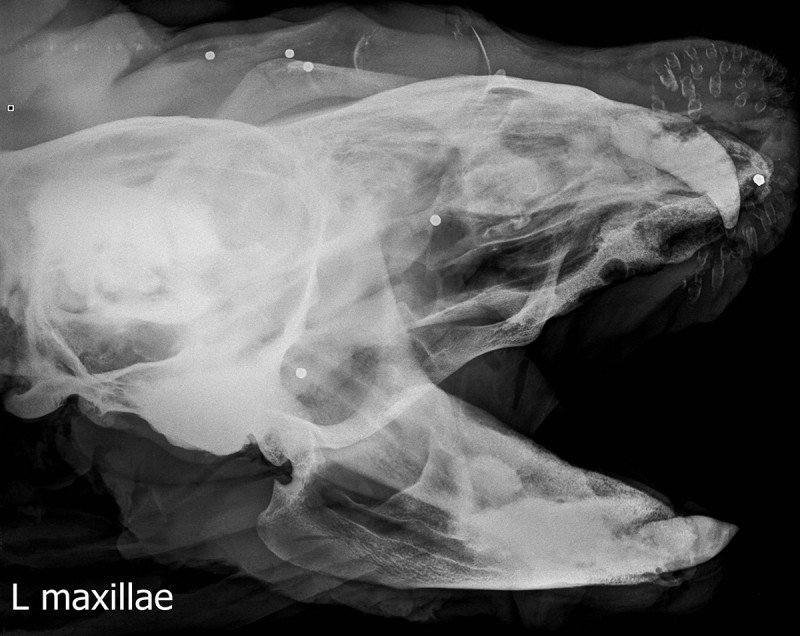 RTG (6.2.2015.): U području glave 11 zrna sačme, u području slabina, križa i repa 51 zrno sačme