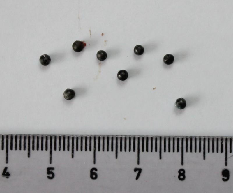'Makroskopski pregled kože i potkožja (9.2.2015.): Iz područja glave izvađena su dva zrna sačme promjera 3,1- 3,2 mm. Jedno se nalazilo desno u području ždrijela, a drugo desno uz dorzalni rub masetera. Zrno nađeno u području ždrijela bilo je uklopljenu u površinsku fasciju ventralno na vratu, dok je drugo zrno bilo dublje, ispod potkožja i platysme u maseteričnoj fasciji. U području slabina izvađena su 8 zrna, manja od onih iz glave, promjera 2,4 -2,6 mm. Ova zrna nalazila su se u dermisu i njihovim vađenjem došlo je do jakog stanjivanja kože. Ostala zrna nisu vađena, jer je predviđena izrada dermoplastičnog preparata u HPM, te da se koža ne bi znatnije oštetila. Oko zrna nisu makrsoskopski vidljive reakcije tkiva, nema krvarenja, niti se vide ulazne rane na koži.