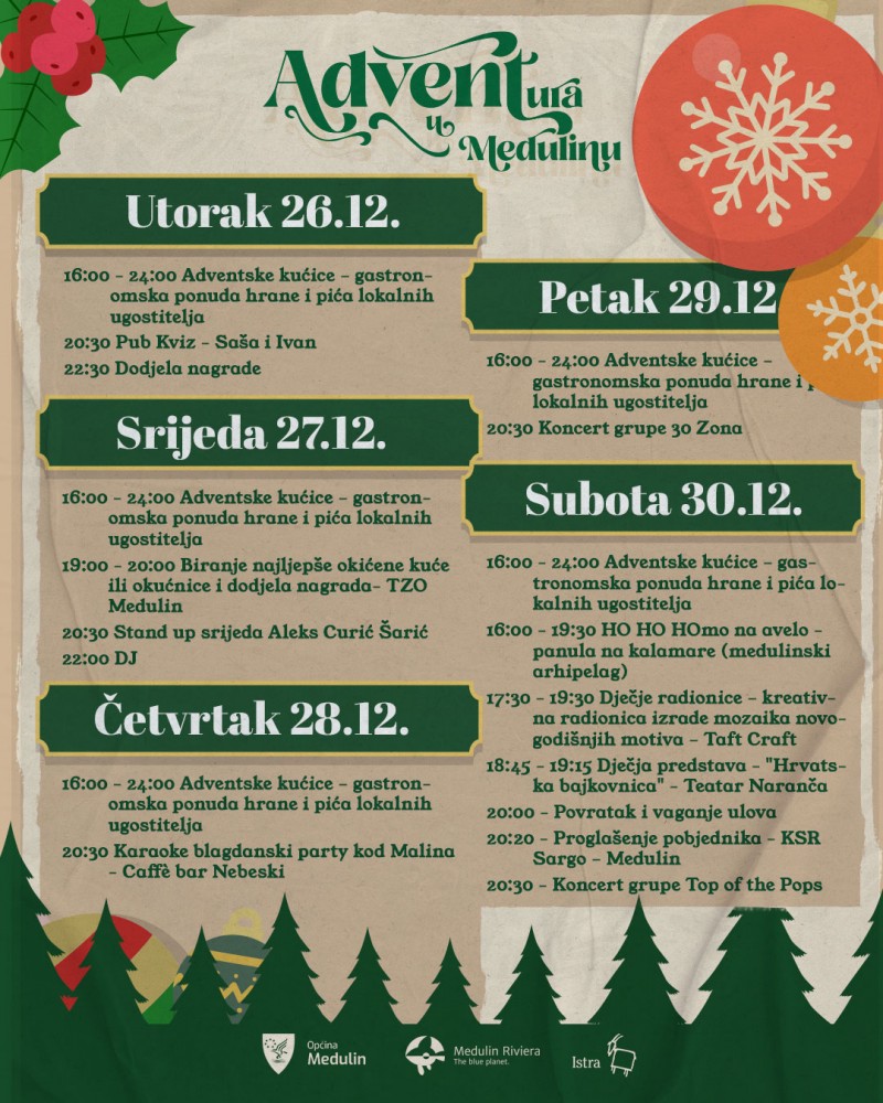 U srijedu 27.12., se po prvi puta bira najljepše ukrašena okućnica Medulin Riviere, zatim slijedi Stand-up Srijedom koji obećava smijanje od „uha do uha“ . Aleks Curić Šarić donosi originalan stand-up show kreiran isključivo za adventsku publiku! Pripremite se na ozbiljno povećanje serotonina. Nakon dobre terapije smijehom, od 22:00h DJ će vas držati u ritmu do kasnih sati!