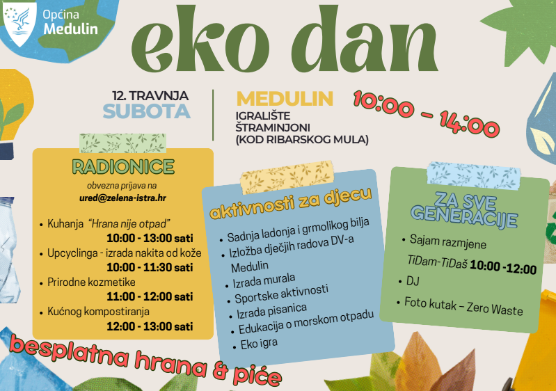 Ako volite druženje uz dobru glazbu i hranu, a pritom vam je stalo do ekologije, ne propustite Eko dan Općine Medulin koji će se održati u sklopu bogatog kulturnog tjedna u Istri na igralištu Štraminjoni (kod ribarskog mula) u Medulinu! Pridružite im se i sudjelujte u radionicama, razmjenama i glazbenom programu koji potiču ekološku svijest na zabavan način!