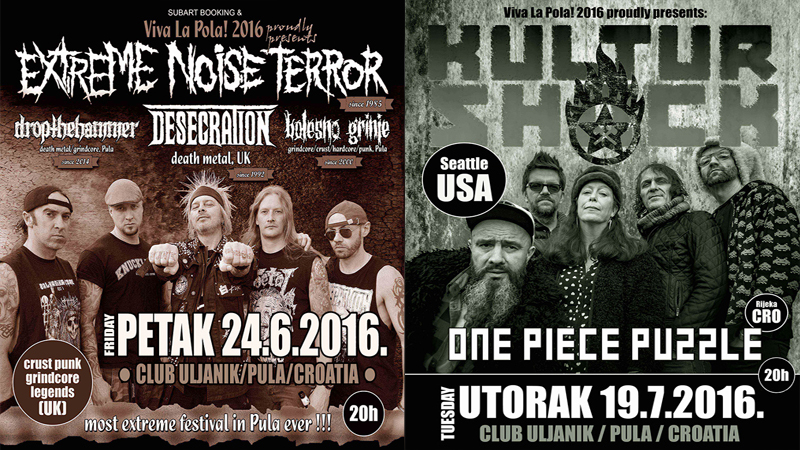 Po prvi puta na ovim prostorima, u petak, 24.6. nastupiti će najpoznatiji svjetski crust punk grindcore bend – EXTREME NOISE TERROR iz Velike Britanije. Uz Napalm Death rodonačelnici zvuka koji je otišao do nemogućih izvedbenih granica, i čijim vizionarskim pothvatima, hard core i metal glazba sredinom osamdesetih su dobili toliko snažan vjetar u leđa da su pokrenuli čitavu revoluciju, koja traje i dan danas i rezultirala je nastankom stotine bendova. EXTREME NOISE TERROR su osnovani 1985. i do dan danas nesmiljeno razaraju svjetskim pozornicama a isto tako i u diskografskom smislu. Vokalist Dean Jones, konstanta benda od samog početka, predstavlja ikonu scene i prema mišljenju mnogih jedan je od najkarizmatičnijih frontmena u svijetu žestoke glazbe ikada. Da ne zaboravimo, uz mega dojmljive nastupe i do kranjih granica odveden glazbeni izričaj, EXTREME NOISE TERROR su uvijek uvelike računa polagali ideološkoj strani, progovarajući o svim boljkama suvremenog društva i svemu onome što društvo čini lošim. Na premijernom nastupu u Puli predstaviti će stvari s prošlogodišnje istoimenog studijskog albuma, a za sve fanove otprašitit će i sve legendarne numere iz dosadašnjeg vremena, između ostalog stvari „Murder“, „Raping The Earth“, „Bullshit Propaganda“, „Show Us You Care“ i dr. Već sada svi su se složili, da je nastup grupe EXTREME NOISE TERROR, nešto što je Pula već duže vrijeme iščekivala.