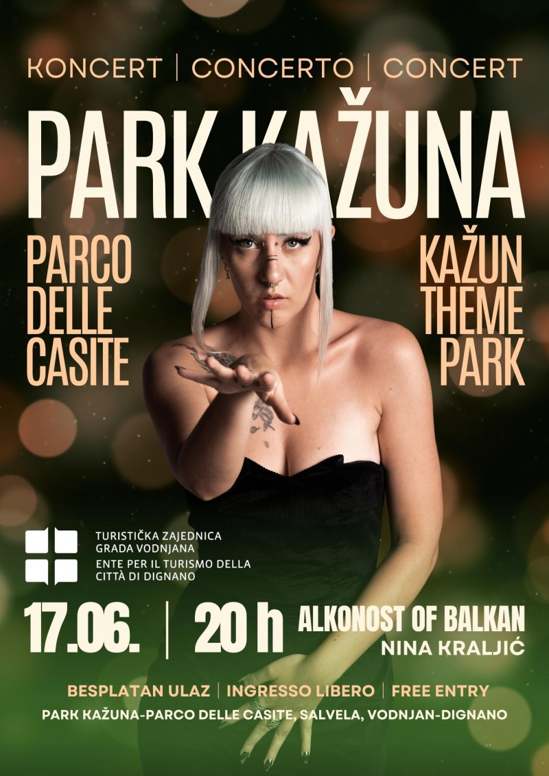 Radionica zvučne kupke započet će u subotu, 17. lipnja, u 17 i 30 u Parku Kažuna u Vodnjanu. Pjevačica Nina Kraljić će koristiti 30 instrumenata, a sudjelovati mogu svi, od najmlađih do najstarijih. 'Stress free' radionica je besplatna. Nakon zvučne kupke Nina će održati i čaroban koncert uz njen acoustic trio sastav u 20 sati. "Bit će to čarobna večer puna prekrasne glazbe omotana u etno, world music, filmsku glazbu i sound healing!", kaže Nina.