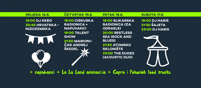 Četiri dana festivala održava se na nogometnom igralištu OŠ Matije Vlačića i u obližnjem parku, a u nastavku možete vidjeti program za naredne dane.