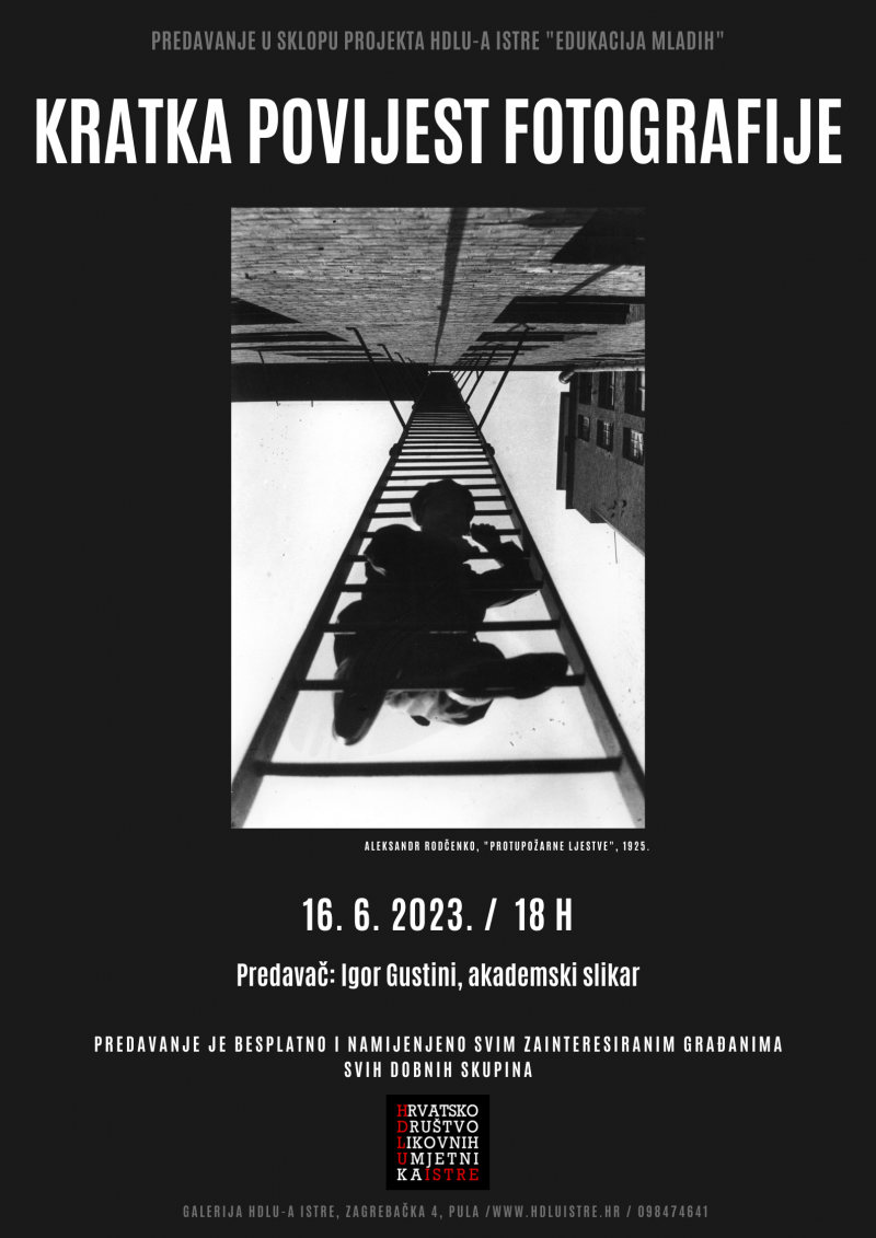 U petak, 16. lipnja, u 18 sati, u galeriji HDLU-a Istre održat će se predavanje "Kratka povijest fotografije". Predavanje je besplatno i namijenjeno svim zainteresiranim građanima, posebno mladima, učenicima i studentima.