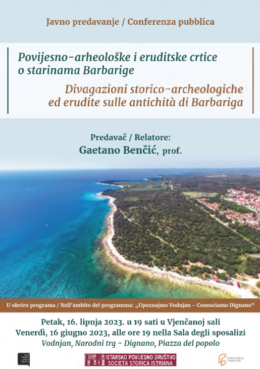 U petak, 16. lipnja s početkom u 19 sati u Sali za vjenčanja u Vodnjanu (Narodni trg) održat će se predavanje Gaetana Benčića, prof., „Divagazioni storico-archeologiche ed erudite sulle antichità di Barbariga“ (Povijesno-arheološke i eruditne crtice o starinama Barbarige). Predavanje se održava u okviru programa “Upoznajmo Vodnjan – Conosciamo Dignano”, s ciljem predstavljanja i popularizacije rezultata znanstvenih i stručnih istraživanja iz arheologije, povijesti, povijesti umjetnosti, etnologije, lingvistike, biologije te drugih znanstvenih i umjetničkih polja s područja Grada Vodnjana. Organizatori su Grad Vodnjan – Dignano, Istarsko povijesno društvo – Società Storica Istriana i Knjižnica Vodnjan – Biblioteca di Dignano.