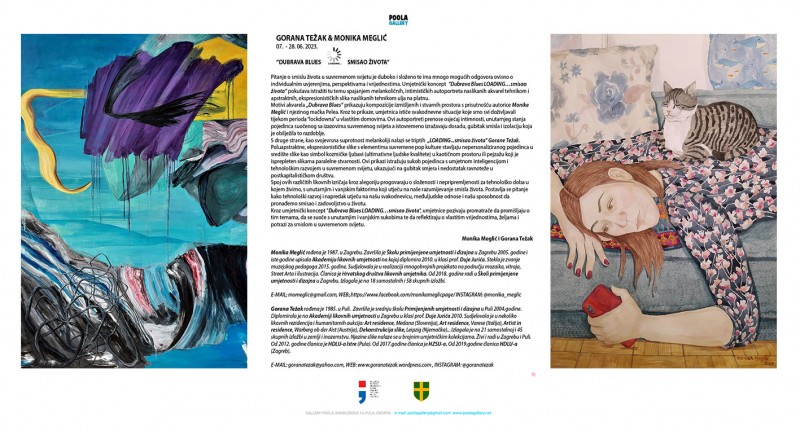 Autorice Gorana Težak Monika Meglić u srijedu, 7. lipnja u 20 sati otvaraju izložbu "DUBRAVKA BLUES loading SMISAO ŽIVOTA" koju možete pogledati u Galeriji Poola, Kandlerova 14, Pula. Izložba će biti otvorena do zadnje srijede ovoga mjeseca, odnosno do 28. lipnja.