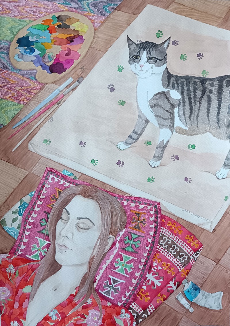 Motivi akvarela "Dubravka Blues" prikazuju kompozicije izmišljenih i stvarnih prostora s prisutnošću autorice Monike Meglić i njezinog mačka Pellea. Kroz te prikaze, umjetnica ističe svakodnevne situacije koje smo svi doživljavali tijekom perioda 'lockdowna' u vlastitim domovima. Ovi autoportreti prenose osjećaj intimnosti, unutar stanja pojedinca suočenog s izazovima suvremenog svijeta, a istovremeno izražavaju dosadu, gubitak smisla i izolaciju koja je obilježila to razdoblje.