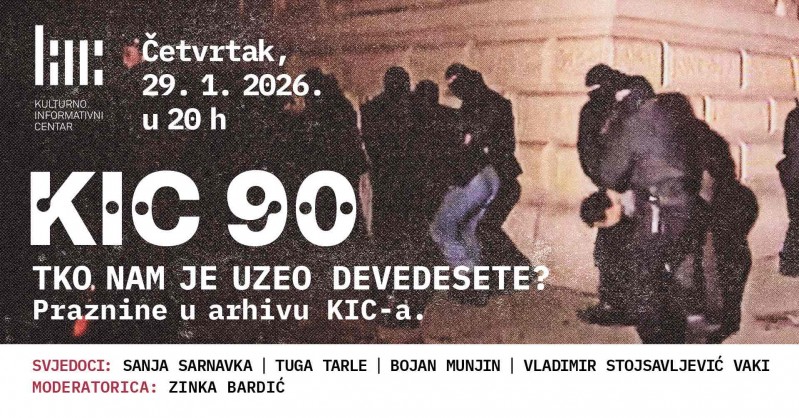 U četvrtak, 29. siječnja 2026. u 20 sati u Kulturno-informativnom centru (KIC), Preradovićeva 5, održat će se tribina KIC 90 – Tko nam je uzeo devedesete? Praznine u arhivu KIC-a, u sklopu projekta KIC 60.