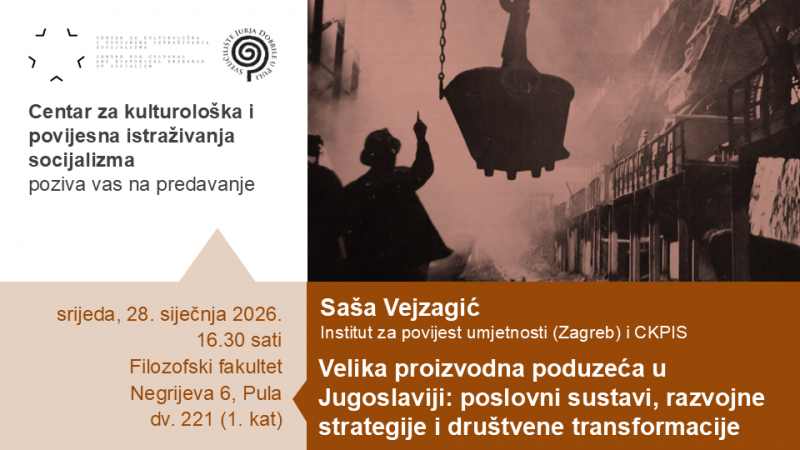 U organizaciji CKPIS-a – u srijedu, 28. siječnja 2026., u 16.30 sati u dv. 221 na Filozofskom fakultetu (Negrijeva 6, prvi kat) – gostujuće javno predavanje pod naslovom Velika proizvodna poduzeća u Jugoslaviji: poslovni sustavi, razvojne strategije i društvene transformacije održat će dr. sc. Saša Vejzagić s Instituta za povijest umjetnosti u Zagrebu.