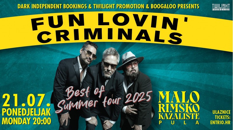 Fun Lovin’ Criminals po prvi put dolaze i u Pulu, gdje će nastupiti na vrlo atraktivnoj open-air lokaciji – Malom rimskom kazalištu, i to u samoj špici turističke sezone. Odsvirat će svoje najveće hitove, što je garancija za sjajan provod koji se ne propušta. Početak koncerta najavljen je za 20:00 sati, a ulaznice su u prodaji putem Entrio.hr sustava i na fizičkim prodajnim mjestima Entria. Cijene ulaznica su: 30 eura za prvih 200 ulaznica, 40 eura nakon toga i 50 eura na dan koncerta. Organizatori koncerta su: Virido S.A., Dark Independent Bookings, Twilight Promotions i Boogaloo.