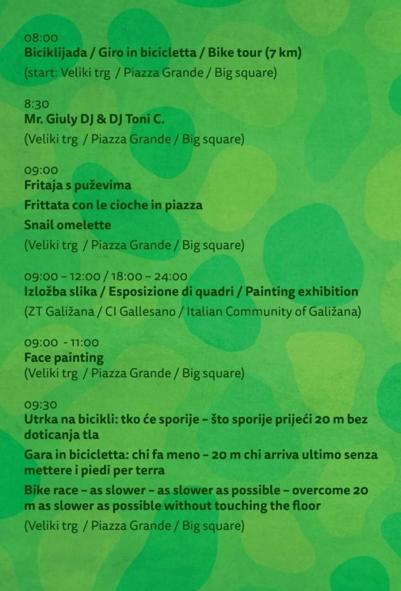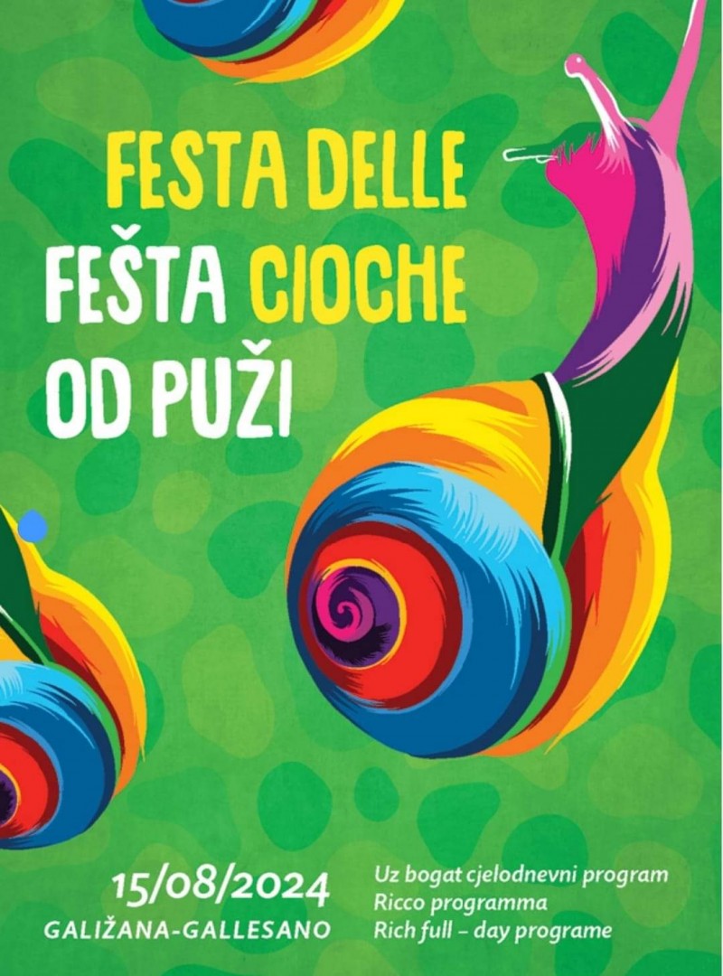 Blagdan Velike gospe, četvrtak 15. kolovoza 2024., ipak je rezerviran za najveću galižansku ljetnu feštu u organizaciji Zajednice Talijana Galižana i Grad Vodnjan – Dignano. Program Fešte od puži - Festa delle cioche počinje već ujutro u 8.00 sati startom sudionika biciklijade duge 7 kilometara na Velikom trgu. Okupljene će na tom mjestu od 8.30 zabavljati Mr. Giuly DJ i DJ Toni C, a u 9.00 sati slijedi zajednička marenda s fritajom s puževima. Od 9.00 do 11.00 sati za djecu će biti organiziran face painting, a u 9.30 sati je na rasporedu uvijek atraktivna utrka na biciklima: Tko će sporije. Sveta misa počinje u 10.30 sati. Od 9.00 do 12.00 sati te od 18.00 do 24.00 sata u ZT-uz Galižana bit će otvorena izložba slika, dok se u 17.00 sati održava kreativna radionica za djecu. Kako je i četvrtak Dan otvorenih vrata crkvi tako se od 9:00 do 11.00 i od 17.00 do 20.00 sati mogu razgledati crkve Sv. Just, S. Rok, Sv. Anton i Crkva Bezgrešnog začeća BD Marije.