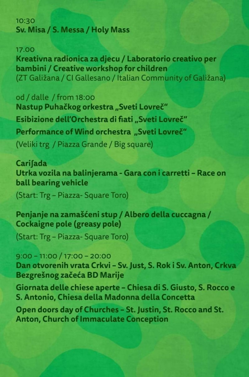 Tradicionalni nastup Puhačkog orkestra "Sveti Lovreč" s defileom kroz mjesto počinje u 18.00 sati, nakon čega ulicama Galižane kreće uvijek atraktivna balinjerada, utrka karića odnosno vozila na balinjerama. Odmah zatim počinje i napeta stara igra penjanja na zamašćeni stup Albero della cuccagna.