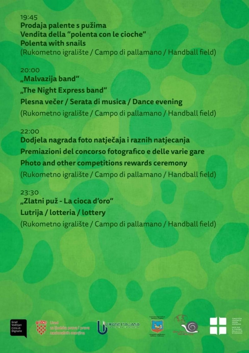 Središnja fešta na rukometnom igralištu s prodajom palente s puževima počinje u 19.45 sati. Od 20.00 sati publiku će zabavljati Malvazija band i The Night Express band. Dodjela nagrada foto natječaja posvećenog puževima i raznih natjecanja počinje u 22.00, a izvlačenje lutrije "Zlatni puž – La cioca d'oro" u 23.30 sati.