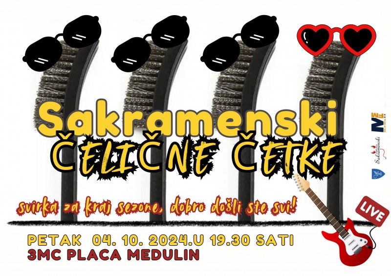 U petak, 4. listopada s početkom u 19.30 sati u medulinskom Multimedijalnom centru (3mc) na placi, (Centar 58, Medulin) nastupiti će glazbeni sastav „Čelične četke“ koji djeluje unutar Udruge Sakramenski.