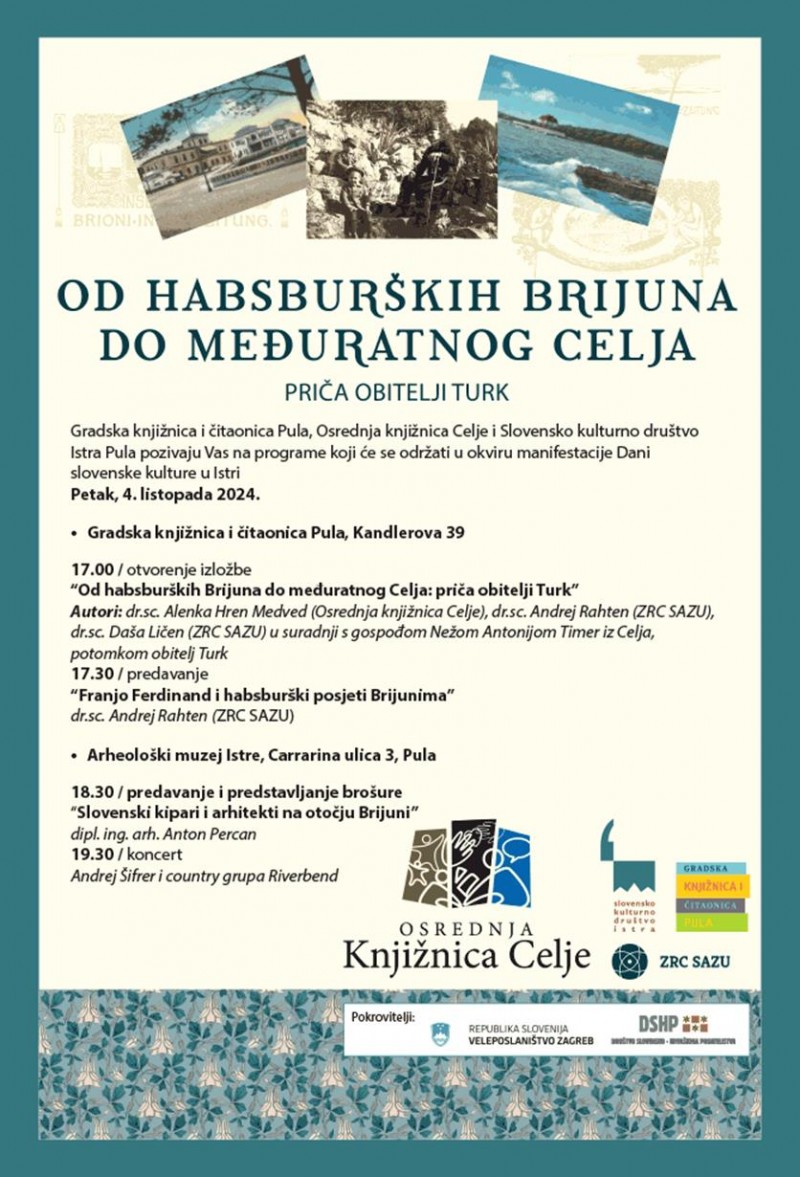 Gradska knjižnica i čitonica Pula nastavlja uspješnu višegodišnju suradnju s Osrednjom knjižnicom Celje i Slovenskim kulturnim društvom Istra Pula: u petak, 4. listopada 2024. u izložbenom prostoru Knjižnice bit će svečano otvorena izložba "Od habsburških Brijuna do međuratnog Celja: priča obitelji Turk" te predavanjem dr. Andreja Rahtena "Franjo Ferdinand i habsburški posjeti Brijunima".