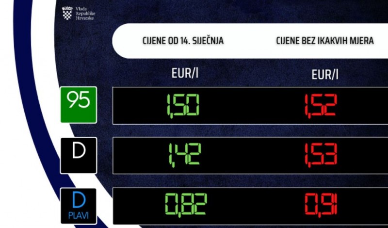 Danas je održana telefonska sjednica Vlade Republike Hrvatske na kojoj je donesena Uredba o utvrđivanju najviših maloprodajnih cijena naftnih derivata sukladno kojoj se najviše maloprodajne cijene računaju po formuli prema osnovnoj cijeni fosilnog goriva u prethodnom 14 dnevnom razdoblju, s ograničenom premijom od 0,1545 EUR/l za dizelsko i benzinsko gorivo, te 0,0781 EUR/l za plavi dizel, a u iznosu 0,8429 EUR/kg smjesa propan - butan za boce, odnosno 0,4116 EUR/kg za velike spremnike.