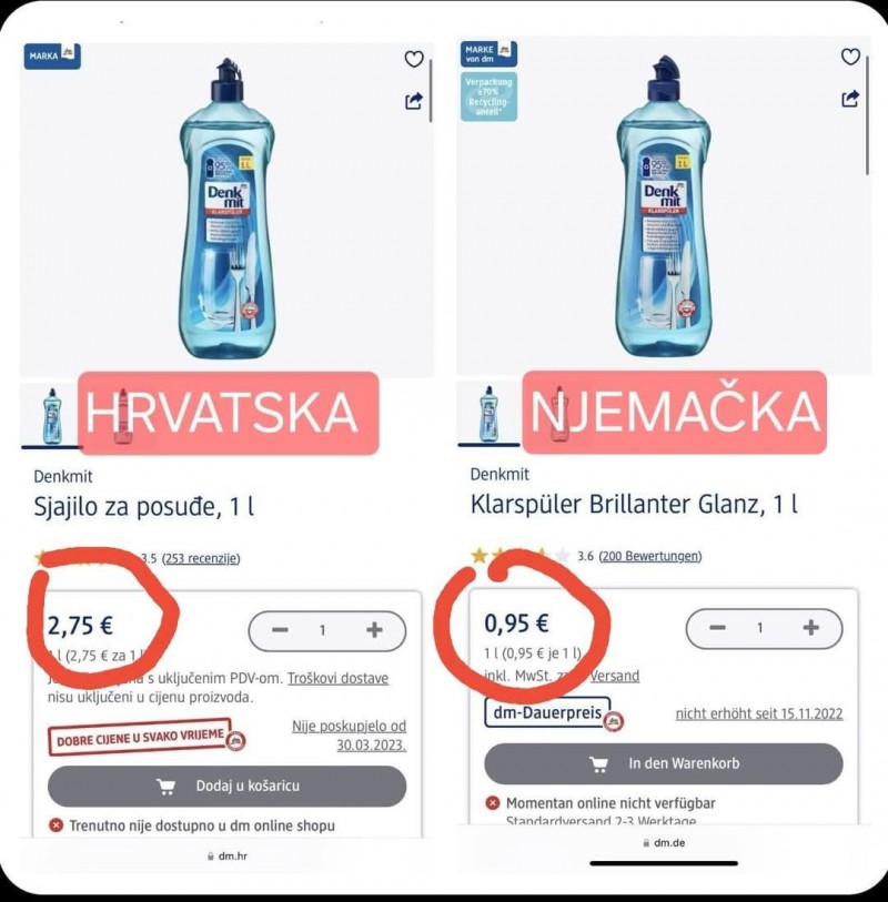 Iz platforme navode da se tržište u Hrvatskoj uspoređuje s tržištima u drugim europskim zemljama, kao što su Njemačka i Bugarska, gdje su cijene u DM-u znatno niže. Na primjer, Schwarzkopf Schauma šampon od 0,40 litre u njemačkom DM-u košta 1,45 €, dok isti proizvod u Hrvatskoj košta 3,35 €, što je više od 130 % skuplje. U Bugarskoj, isti šampon stoji 2,77 €, što je gotovo 20 % niža cijena nego u Hrvatskoj.