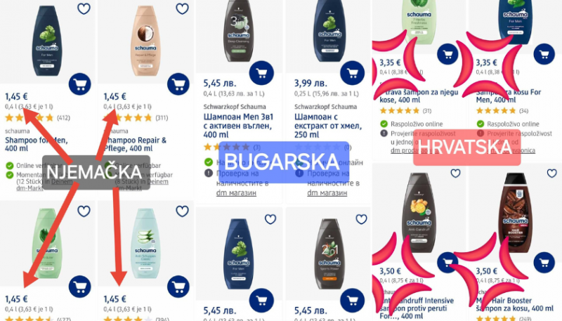 U Njemačkoj Schwarzkopf Schauma šampon od 0,40 litre u tamošnjem Dm-u košta 1,45 €, dok u Hrvatskoj, u istom tom trgovačkom lancu, košta 3,35 €, što je za više od 130 % skuplje od bogate Njemačke!!!