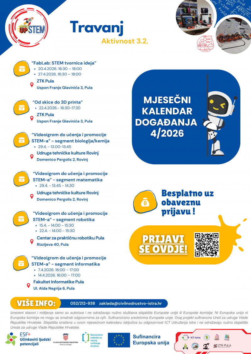 ICT Istra u sklopu projekta 'LevelUP STEM: Istraži, nauči, stvori!' tijekom travnja 2026. s partnerima organizira besplatne STEM radionice namijenjene učenicima osnovnoškolske i srednjoškolske dobi. Cilj radionica je poticanje interesa za STEM područja kroz kreativan, praktičan i suvremen pristup učenju, uz korištenje inovativnih tehnologija.