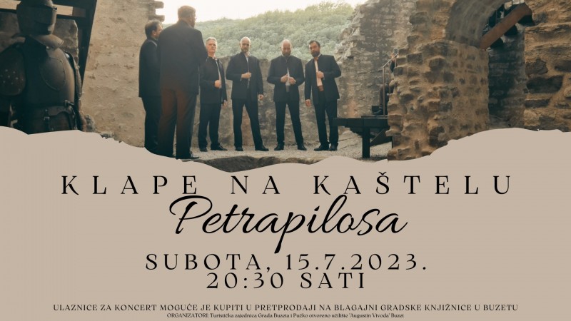 U subotu, 15.7. s početkom u 20:30 sati u prekrasnom ambijentu kaštela Petrapilosa uživat ćemo u klapskim napjevima poznatih muških i ženskih klapa iz Istre i Kvarnera.
