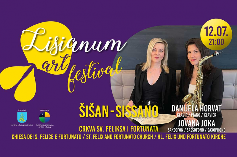 Pozivamo Vas na Lisianum Art Festival. Večeras, srijeda 12. srpnja, crkva sv. Feliksa i Fortunata u Šišanu, u 21 h. Danijela Horvat – klavir i Jovana Joka - saksofon.