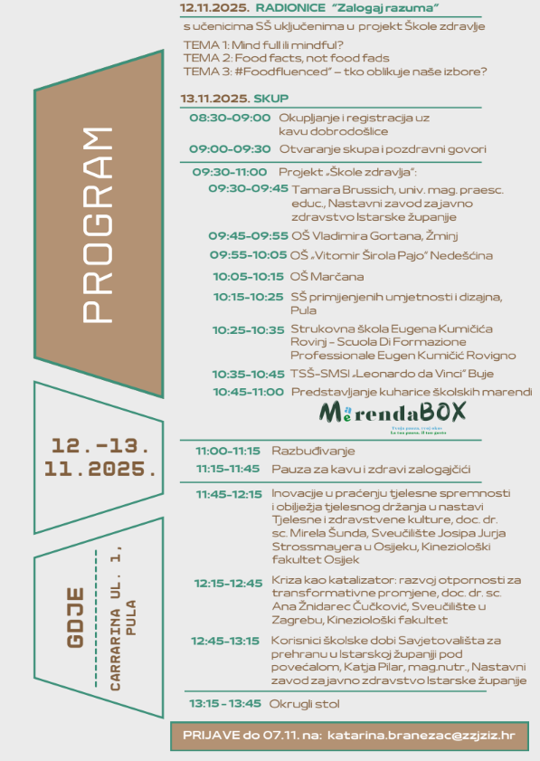 Kroz predavanja, radionice i predstavljanje pilot projekta „Škole zdravlja“ kojeg u 2025. godini provodimo u suradnji s Istarskom županijom u tri srednje i tri osnovne škole, tijekom skupa sudionici će imati priliku upoznati provedene aktivnosti, ali i nove pristupe osnaživanju mentalnog zdravlja, važnosti pravilne prehrane, tjelesne aktivnosti i održivih životnih izbora.