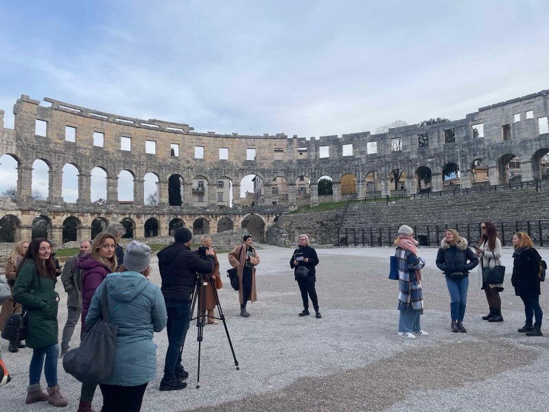 U subotu, 21. veljače, na Međunarodni dan turističkih vodiča, znanje je preseljeno na teren kroz edukacijsku turu „Istra u kadru – Filmski itinereri uživo“. Sudjelovali su polaznici edukacije za interpretatore filmske baštine, predstavnici turističkih zajednica, turistički vodiči, travel blogerica, predstavnici medija te brojni drugi zaljubljenici u Istru i film. Na edukativnoj turi filmove snimane u Istri predstavila je Aleksandra Vinkerlić, koja je kroz višegodišnji rad istražila njihovu povijest, mapirala lokacije, dokumentirala produkcije i valorizirala njihovu kulturnu i turističku važnost. Sudionici su obišli pulsku Arenu, gdje su predstavljeni počeci igranog filma u Puli: od povijesnih spektakala do suvremenih međunarodnih produkcija te Limski kanal, filmski „vikinški fjord“, uz pop-up izložbu fotografija sa snimanja filma Dugi brodovi, vraćajući se nakratko u 1954. godinu kada je Lim „glumio“ norveški pejzaž i u kojem je bilo izgrađeno vikinško selo „Scania“.