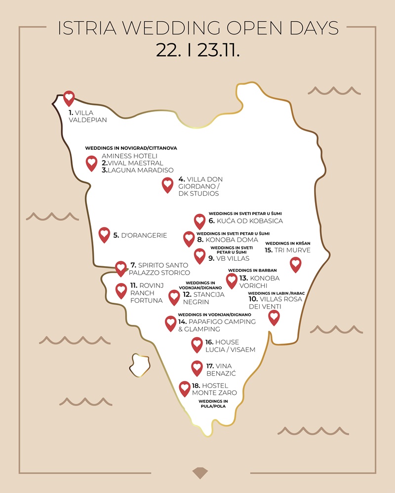 Tijekom 22. i 23. studenog od 11 do 16 sati, posjetitelji će moći obići 18 lokacija diljem Istre, od Savudrije do Pule. Svaka lokacija predstavlja jedinstven spoj usluga te otvara vrata svim budućim mladencima i wedding profesionalcima. Lokacije od sjevera prema jugu Istre: Savudrija Villa Valdepian, Weddings in Novigrad Vival Maestral Hotel by Aminess i Laguna Maradiso Hotel by Aminess, Vižinada Villa Don Giordano / DK Studios, Funtana D’Orangerie, Rovinj Spirito Santo Palazzo Storico i Ranch Fortuna, Weddings in Sveti Petar u Šumi VB Villas, Kuća od kobasica i Konoba Doma, Weddings in Barban Konoba Vorichi, Weddings in Labin / Rabac Villas Rosa dei Venti, Weddings in Kršan Tri Murve, Weddings in Vodnjan Stancija Negrin, House Lucia / Visaem, Papafigo Camping & Glamping, Pula Vina Benazić i Hostel Monte Zaro.