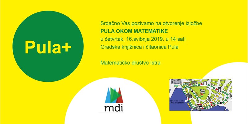 Izložba Pula okom matematike Matematičkog društva Istra bit će otvorena u Središnjoj knjižnici u četvrtak, 16. svibnja 2019. u 14 sati. Ova izložba jedna je je od aktivnosti kojom Matematičko društvo obilježava 10 godina djelovanja.