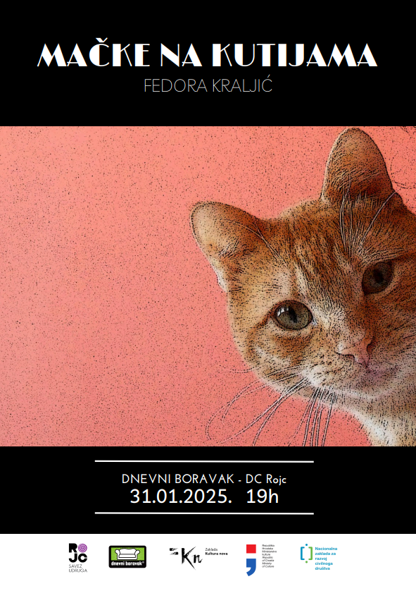 U petak, 31. siječnja 2025. godine, s početkom u 19:00, Dnevni boravak Rojca predstavlja prvu samostalnu izložbu mlade autorice Fedore Kraljić „Mačke na kutijama (Ulomci iz mačkodnevnika)”.