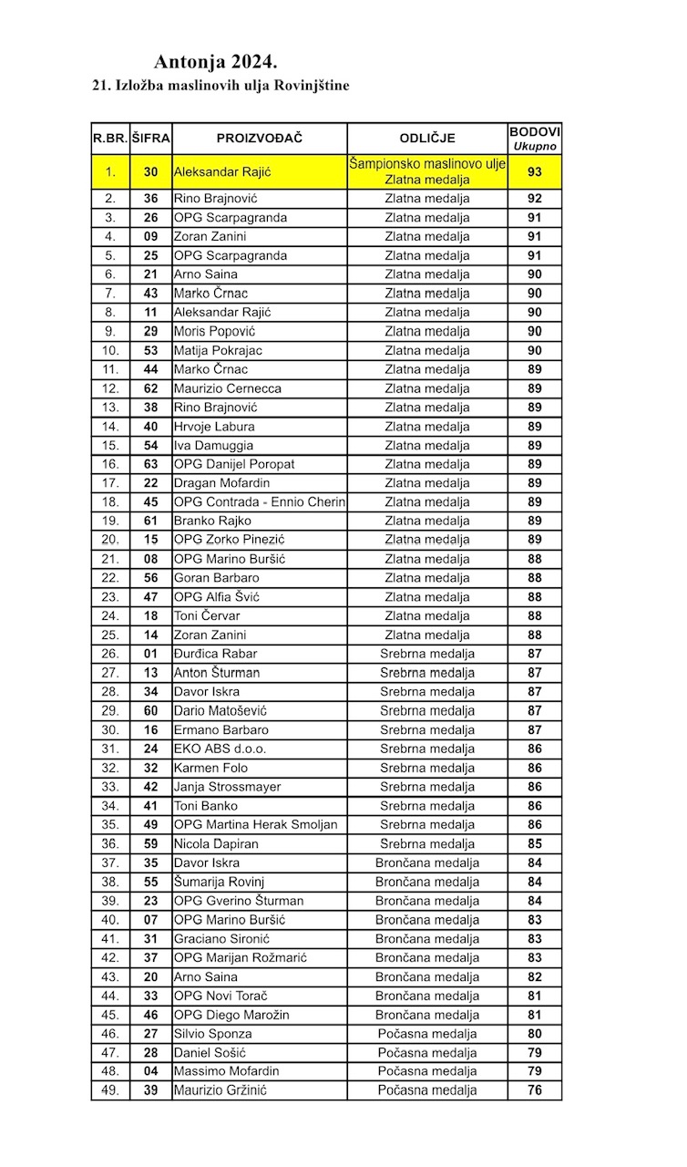 Posebno se ističu prva 3 ulja proizvođača među kojima su odlučivale nijanse u mirisima i okusima, a to su ulja Aleksandra Rajića, Rina Brajnovića i OPG Scarpagranda. Šampionsku zlatnu titulu ove godine osvojio je Aleksandar Rajić, s ukupno 93 boda. Vina Rovinjštine 2024. godine odlikuje vrlo visoka kvaliteta. Uzorci su predani na ocjenjivanje u Institut za poljoprivedu i turizam iz Poreča koji su obavili fizikalno–kemijske analize i organoleptički (senzorno) ocijenjivanje u kategoriji vina proizvedenih modernom i tradicionalnom tehnologijom. Ukupno je prikupljeno 43 uzorka vina: 18 uzoraka u kategoriji Profesionalni proizvođači – bijela vina, zatim 5 uzoraka u kategoriji Profesionalni proizvođači – crna vina, 9 uzoraka u kategoriji Proizvođači hobisti – bijela vina i Proizvođači hobisti – crna vina ukupno 10 uzorka.